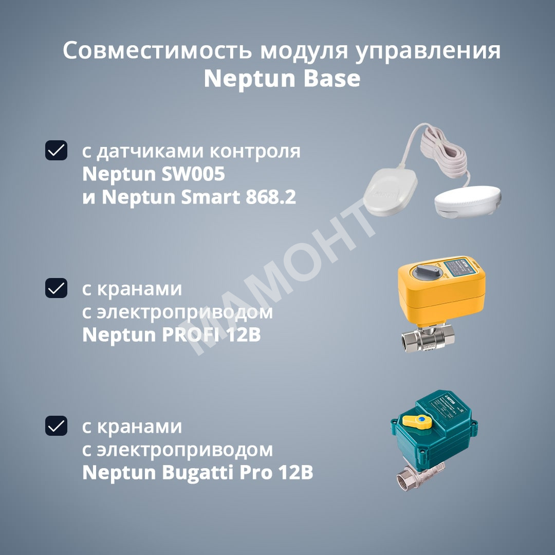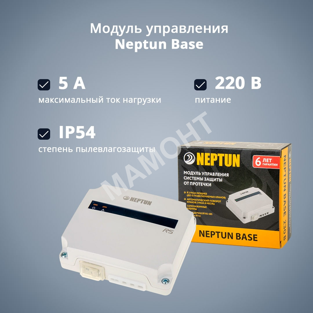 Он обрабатывает сигналы от проводных датчиков контроля протечки воды и выдает управляющий сигнал на шаровые краны с электроприводом для автоматического перекрытия водоснабжения.