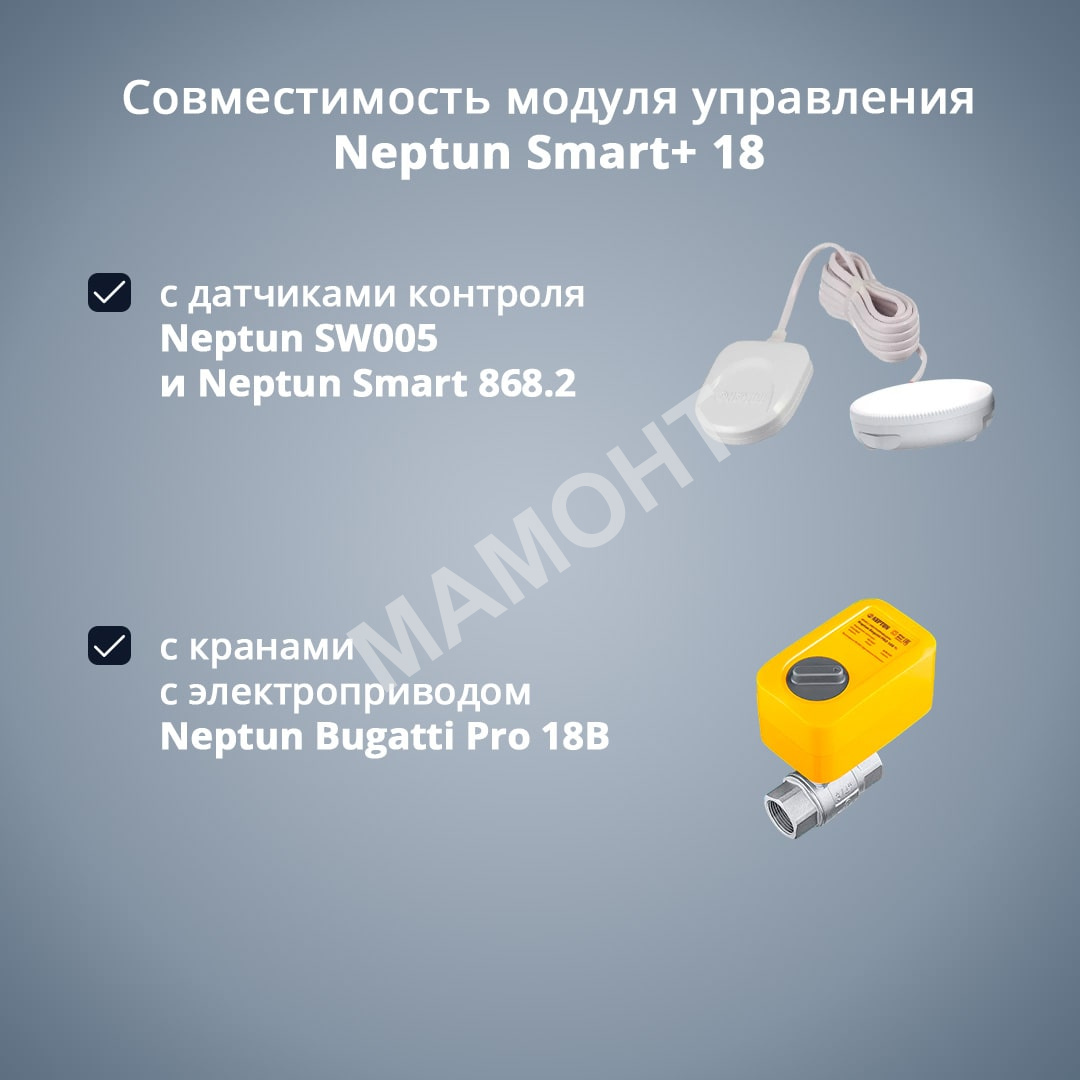 Он обрабатывает сигналы от проводных датчиков контроля протечки воды и выдает управляющий сигнал на шаровые краны с электроприводом для автоматического перекрытия водоснабжения.
